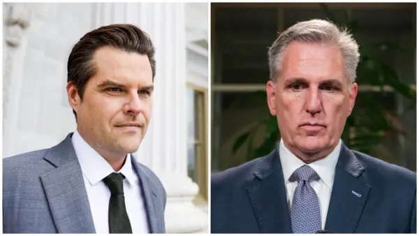 (Left) Rep. Matt Gaetz (R-Fla.) departs from the U.S. Capitol Building in Washington on Sept. 29, 2023. (Anna Moneymaker/Getty Images), (Right) House Speaker Kevin McCarthy (R-Calif.) speaks with members of the media following a meeting of the Republican House caucus in Washington, on Sept. 30, 2023. (Nathan Howard/Getty Images)[/caption]