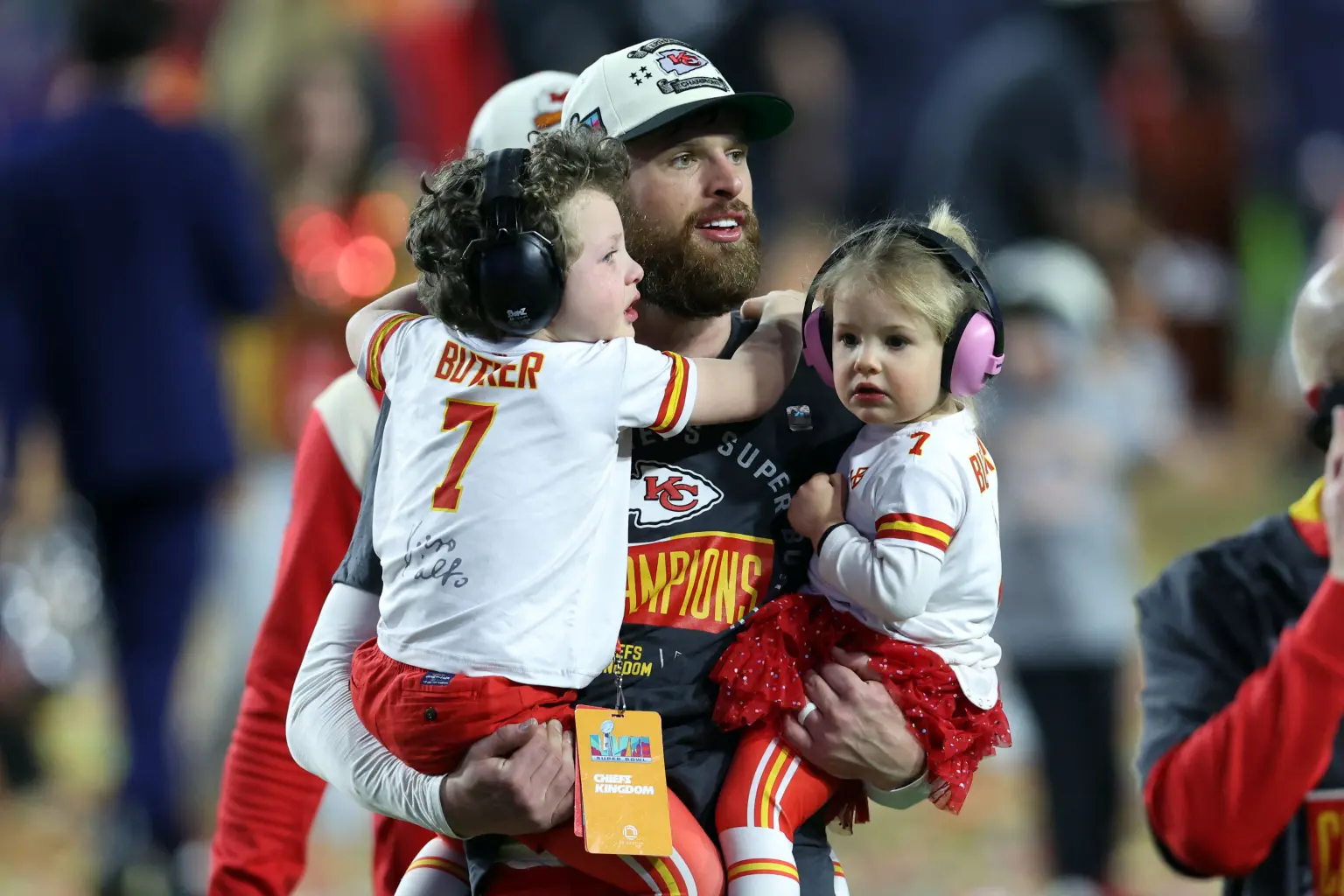 Kansas City Chiefs place kicker Harrison Butker (7) celebrates with his children after the Kansas City Chiefs defeated the Philadelphia Eagles in Super Bowl LVII at State Farm Stadium.USA TODAY Sports[/caption] [caption id="attachment_15190" align="alignnone" width="1536"]